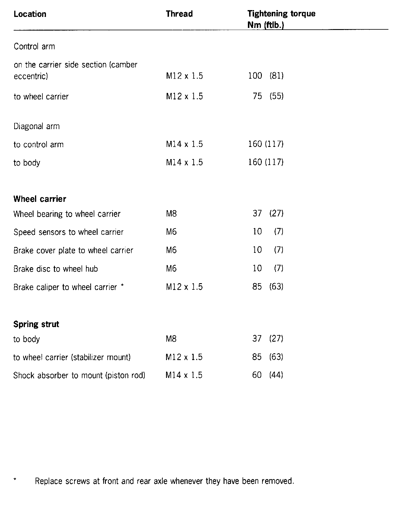 Tightening torques for rear axle