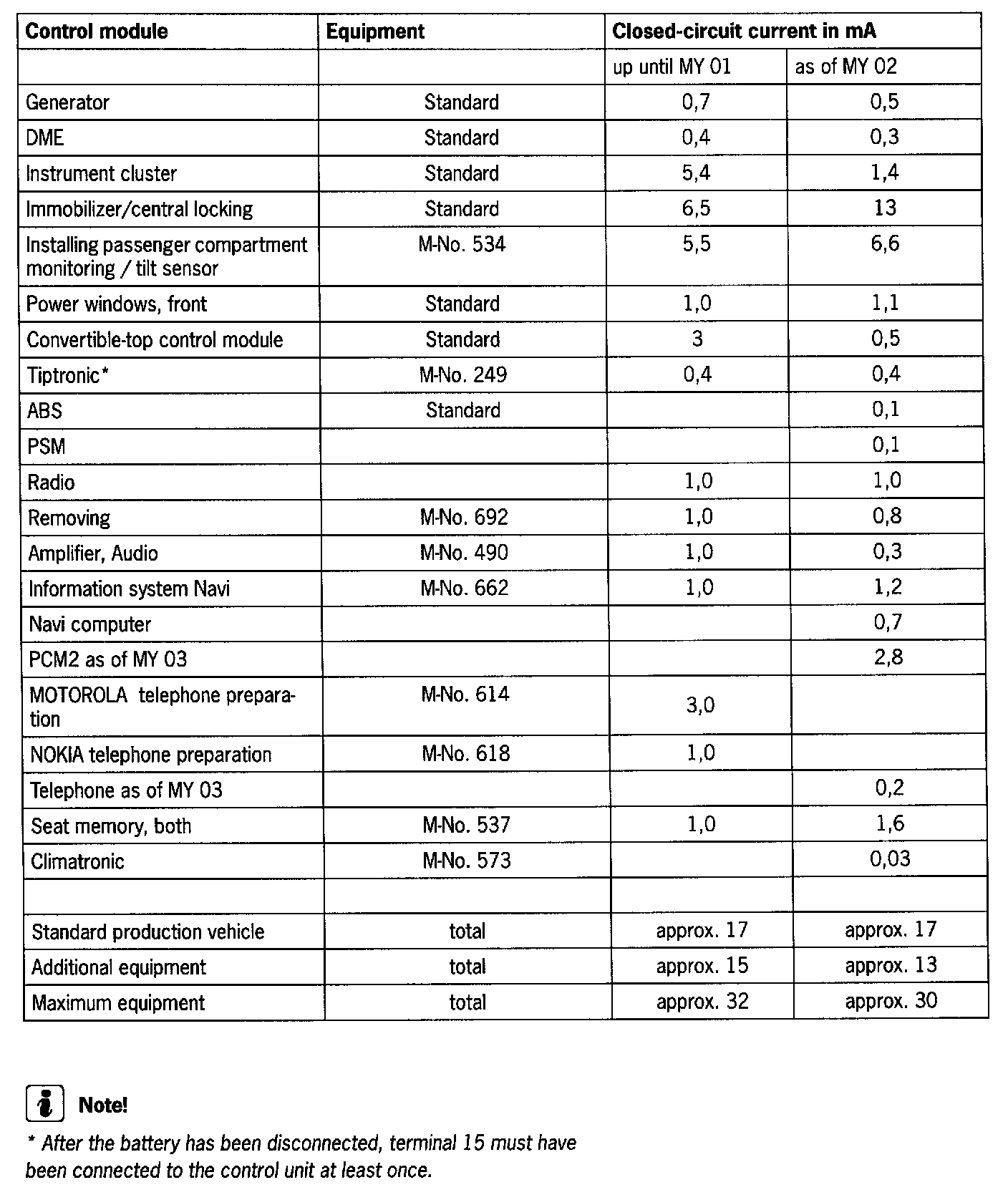 NOTE: Before measuring the closed-circuit current, determine the vehicle equipment (M-number, I-number) and establish the expected closed-circuit current with the aid of the attached table.