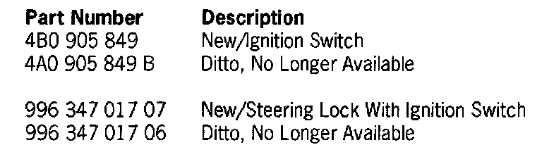 As of the date of introduction below, a modified ignition switch will be installed in vehicles. For spare parts replacement of the ignition switch, only the new ignition switch, part number, 4B0 905 849, is available now as a replacement part.