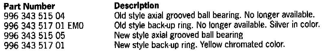 Using the old style back-up ring, part number, 996 343 517 01 EMO in conjunction with new style axial grooved bearing, part number, 996 343 515 05 will damage the spring strut mount.Caution!