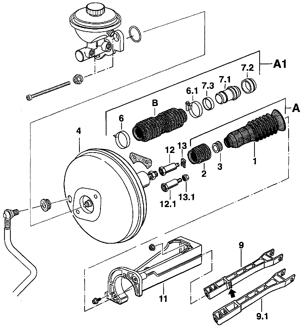 ^ To convert the bellows variant -A- to version -A1-, the hydraulic unit, the brake booster -4- with brake master cylinder and the intermediate piece -11- must be removed.