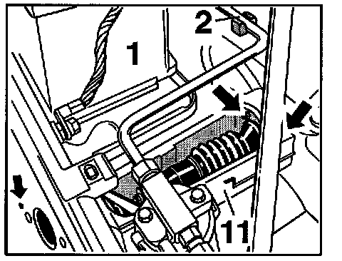 5. Undo intermediate piece -11- -arrow- (2 M8 nuts and hexagon socket head bolt) and remove in the direction of the battery. Unclip air-conditioning line -2- from the holder.