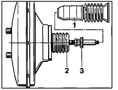 6. Remove the bellows -1- on the fire wall and the bellows -2- on the brake booster. Pull off the grommet (rubber groove ring) -3-.