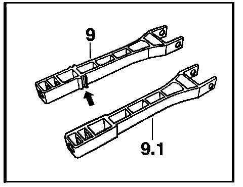The former brake pushrod -9- with guide (double rib) -arrow- is to be replaced with the brake pushrod -9.1- without guide!