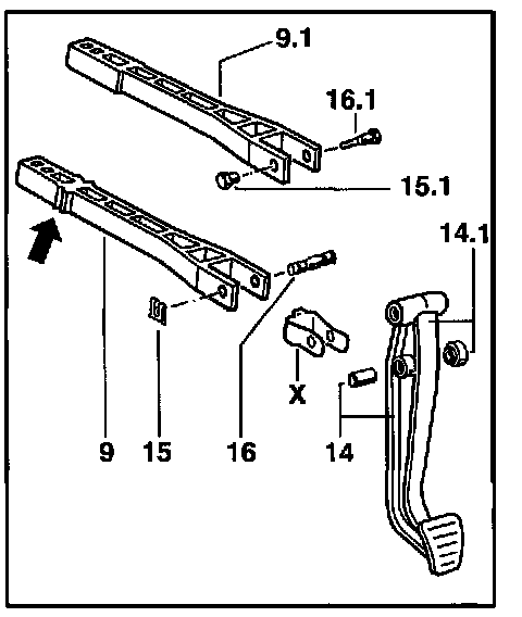 ^ Installation of the new brake pedal -14.1- is necessary as the connection to the push rod in model '97-9-is made with a pin (self-aligning bolt) -16- with a mechanical locking device -15-. Connection as of '98 model: Threaded bolt -16.1- with threaded bushing -15.1-.
