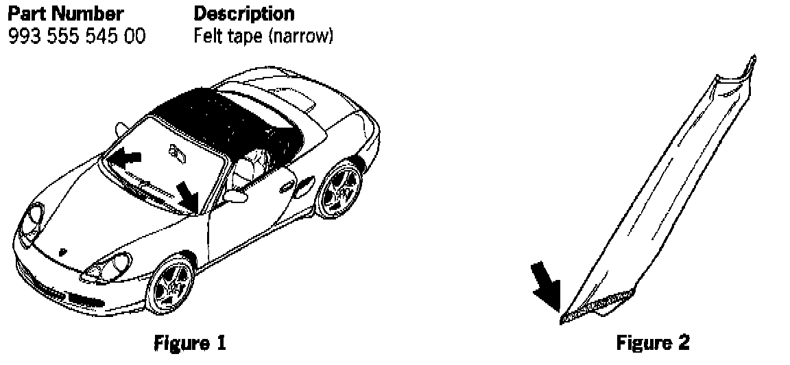 2. Stick a 10 mm wide felt strip onto the A-pillar trim above the lower edge (arrow, figure 2.)