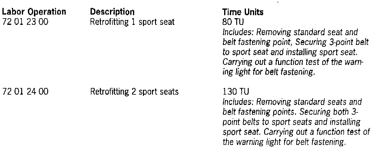 The sport seat does not have provisions for: adjustable height, lumbar support, or backrest adjustment. Longitudinal adjustment (fore/aft seat position) is only available as a manual adjustment. Additionally, seat memory and seat heating junctions cannot be used with the sport bucket seat.