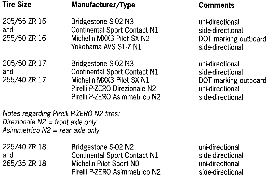 "N0", "N1", "N2", "N3" indicates a specification identification of the tires. The complete "N number must be present and visible on the outside of the tire side wall near the type designation. Only use tires of the same manufacturer, tire type and "N" specification on one vehicle.