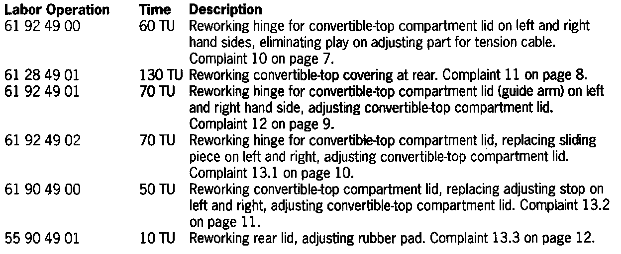 The following information contains the most up to date specifications for repairing complaints of noises in the convertible top and the convertible-top compartment lid. Before beginning the work, please road test the vehicle to isolate the area where the noise is coming from. Then refer to the technical bulletin for assistance After completing work road test the vehicle again to confirm the noise was eliminated.