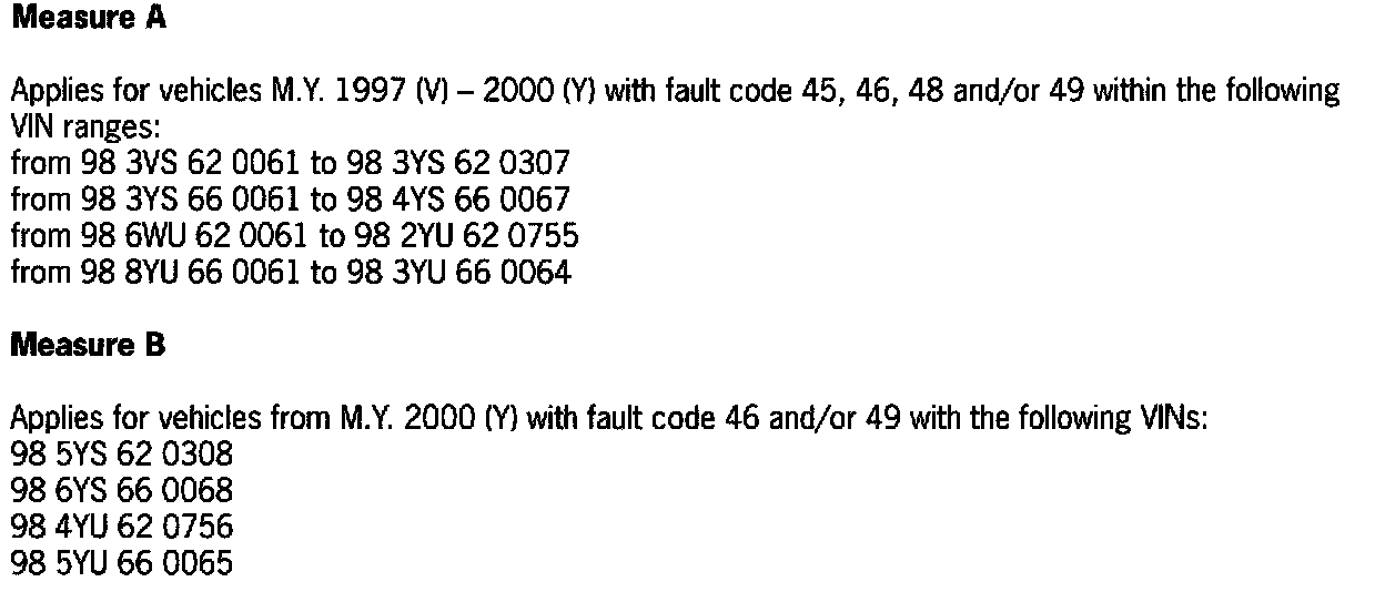 If one or more of the above-mentioned fault codes are read out during diagnosis after the airbag warning light has come on, this means that - depending on the model year - Measure A or B must be carried out on the driver's seat and/or the passenger's seat. Refer to the VIN numbers shown.