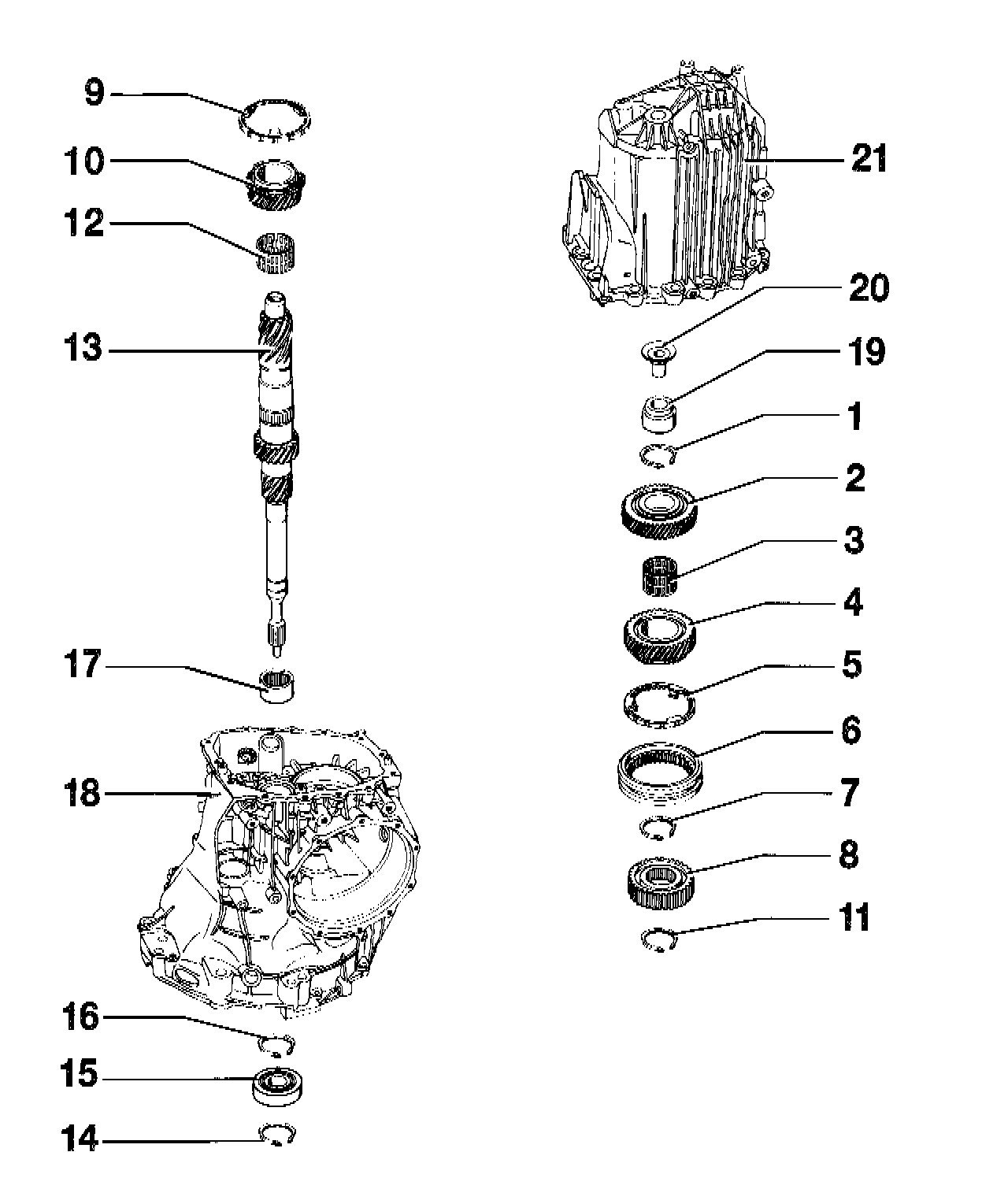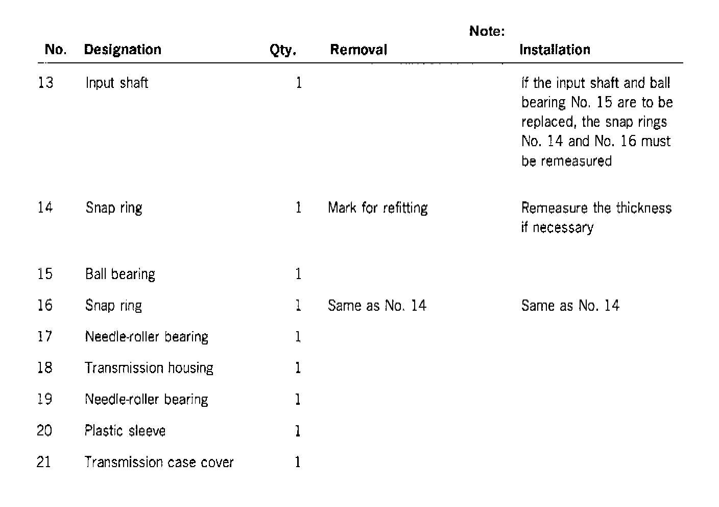 Note Since snap rings of different sizes and thicknesses are used, the individual snap rings must be identified (e.g. with numbers). The thickness of the individual snap ring must be determined again if a directly affected component is replaced.