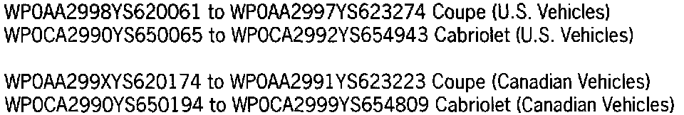 Not every vehicle in the shown range may be affected. Use the ranges as a general guideline. Refer to Attachment "A" to determine if a particular vehicle is eligible for this service action. Alternatively, the VIN can be checked in the Porsche E-DCS/WWS for confirmation of an open service action (or recall campaign).