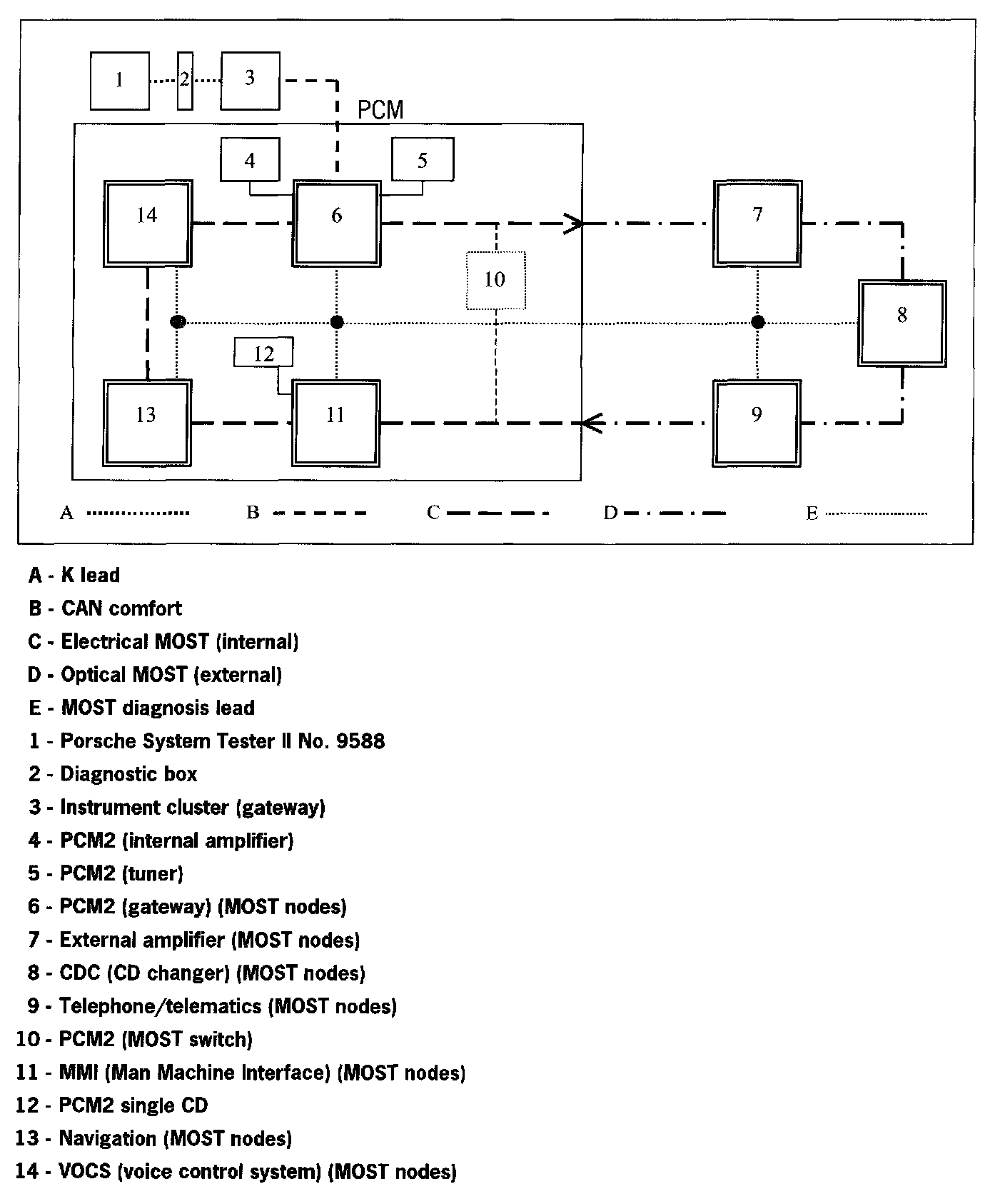 The PCM2 consists of at least two but a maximum of four MOST nodes, (Gateway, MMI and Navigation and VOCS (optional)), which communicate with each other via the electronic MOST. Data is transferred outside of the PCM2 via the optical MOST.