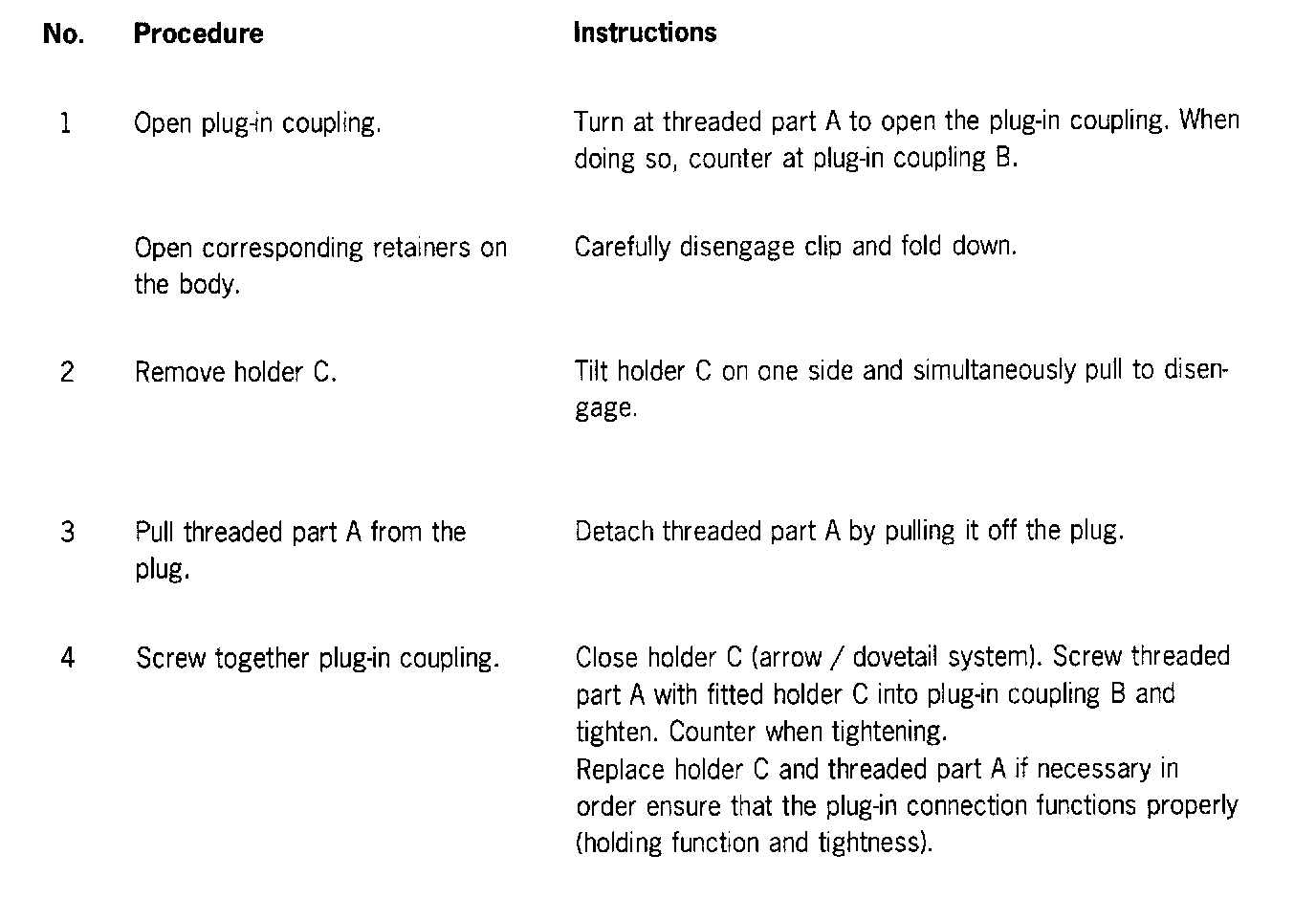 Perform preparations carefully when handling plug-in couplings - e.g. cleaning and fitting the plugs - as repairs are possible only by replacing the affected line in most cases. Only the threaded part A (with fitted O-rings) and the holder C are available as individual parts for the plug-in coupling. See illustration.