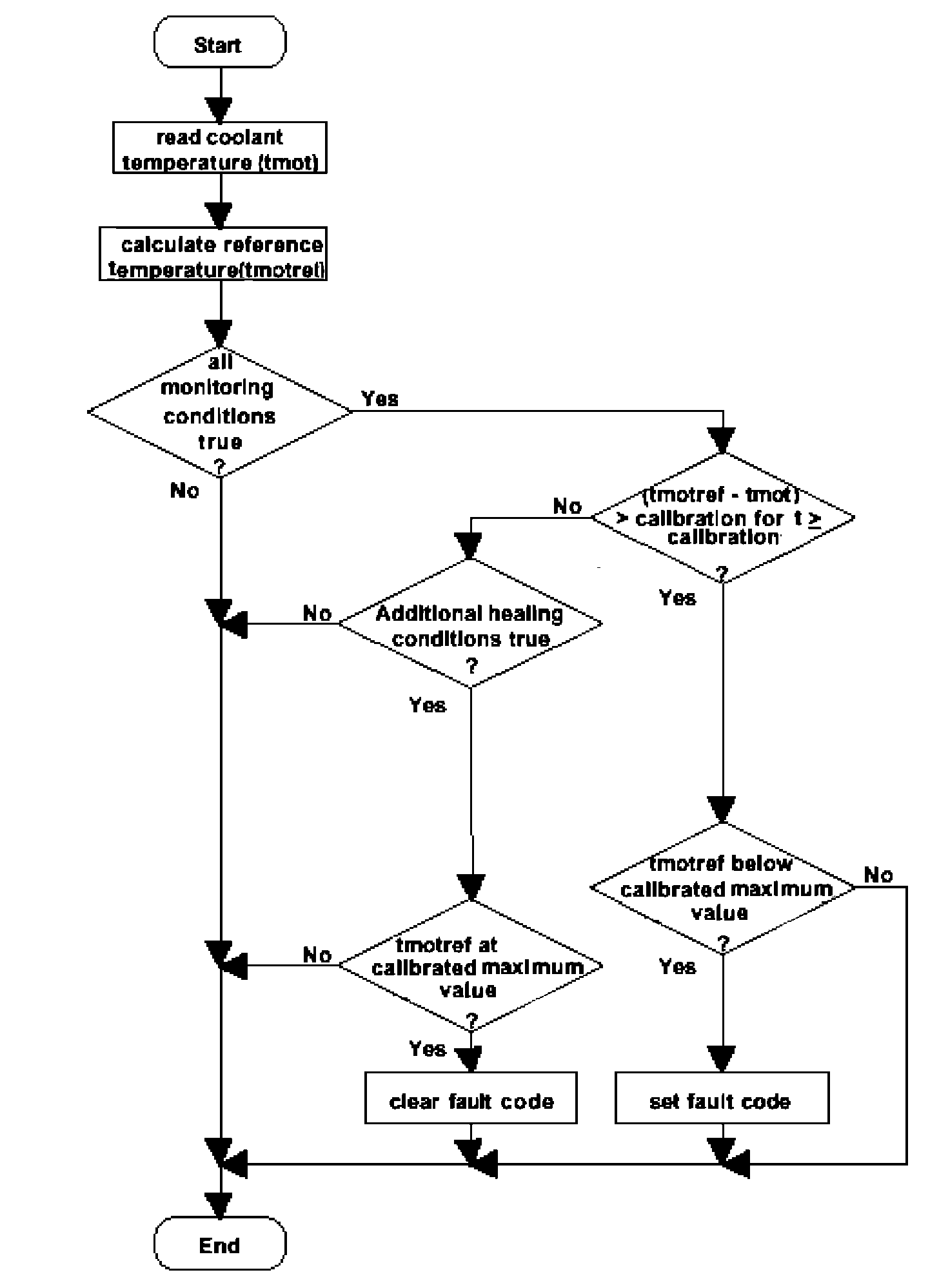 Due to a missing or stuck open thermostat the cooling temperature rise is delayed, especially at low ambient temperatures. The picture below shows an overview of the monitor. The thermostat monitor is designed to detect a delay in the warming up of the engine coolant temperature. Therefor the calculated reference temperature (based on coolant temperature at maximum heat radiation with functioning thermostat) is reused. At enabled monitoring conditions the difference between the calculated reference temperature and the coolant temperature is checked. If the difference is above a calibrated threshold for a calibrated period of time and the calculated reference temperature has not yet reached its maximum value, the fault is detected and its fault code is set. If the difference remains below the calibrated threshold for a time period longer than the above mentioned time an error from a previous warm up cycle may be cleared as soon as the calculated reference temperature has reached its maximum value.