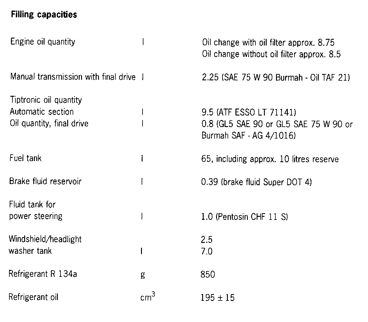 Filling capacities