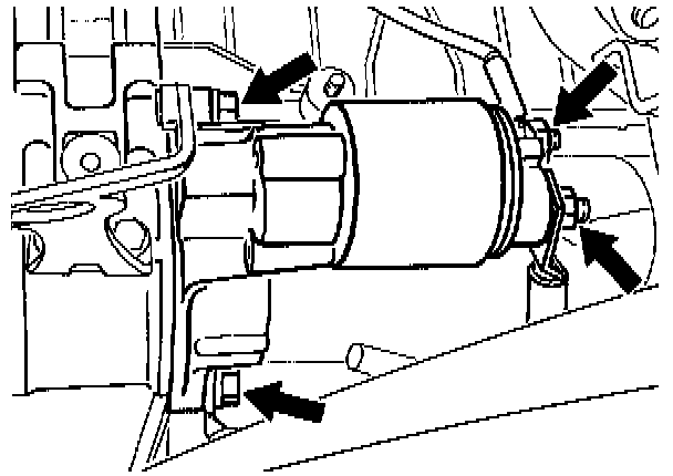 5. Loosen cable at terminal 30 (M8) and terminal 50 (M6) at solenoid switch. Undo both hexagon-head bolts M10 on the starter and remove ground cable. Withdraw starter upwards from its bracket.