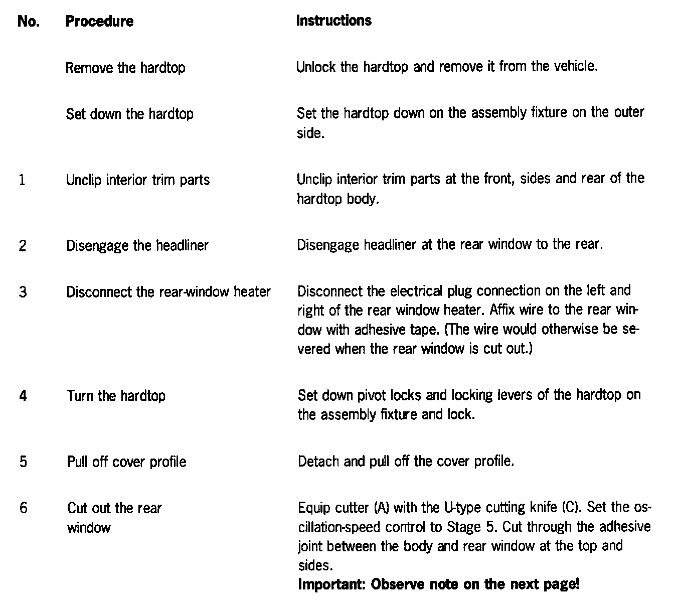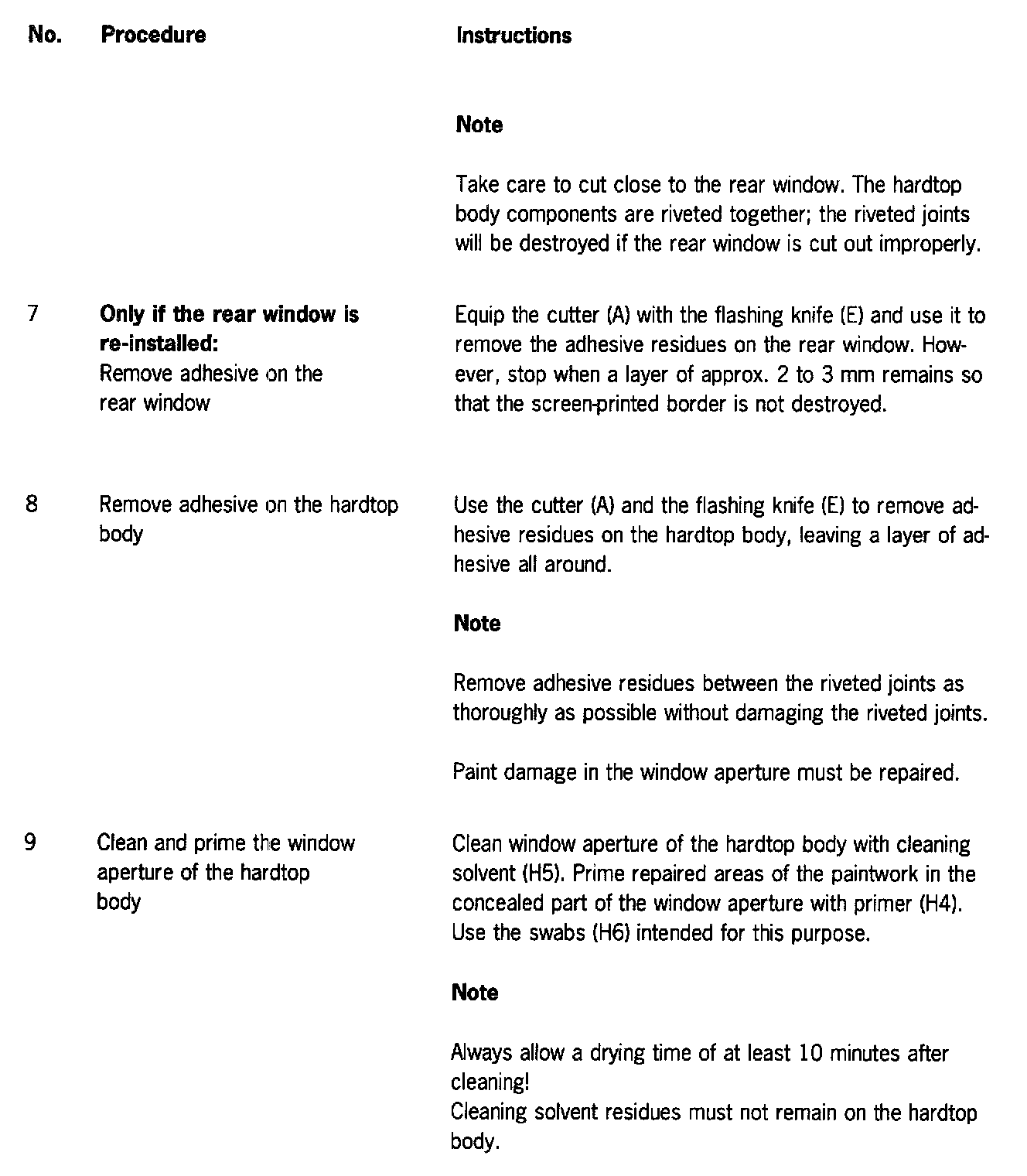 The following tools and materials are required for removal and installation of the rear window with two component adhesive: