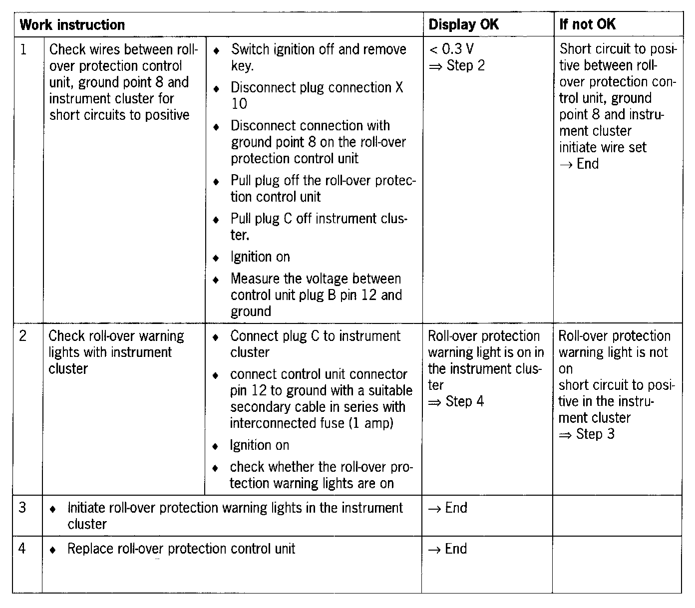 - Short circuit to positive in the wiring between warning lights and roll-over protection control unit