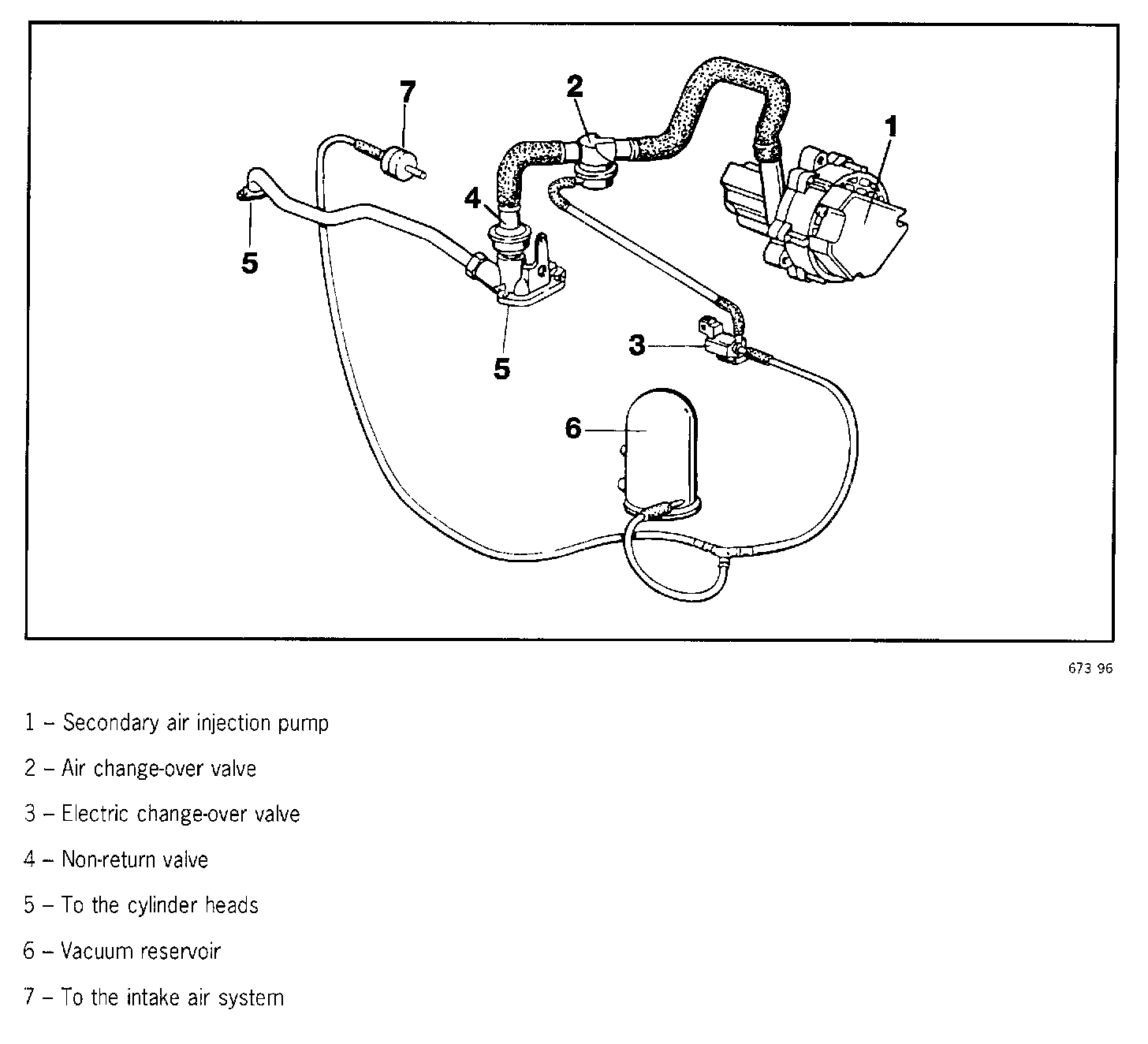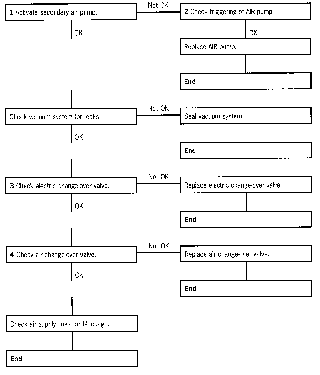 If vacuum is present at the air change-over valve, check air supply from the AIR pump to the changeover valve up to the air supply line to the cylinder heads.