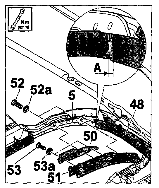 1. Position styling frame -51- on roof frame 2 -5-. Adjust gap dimension -A = 3.1 + 0.5- between styling frames 2 and styling frame 3 -48-. Screw on fastening screws -53- and the washers -53a-.
