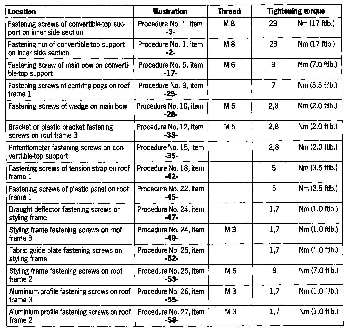 Tightening torques