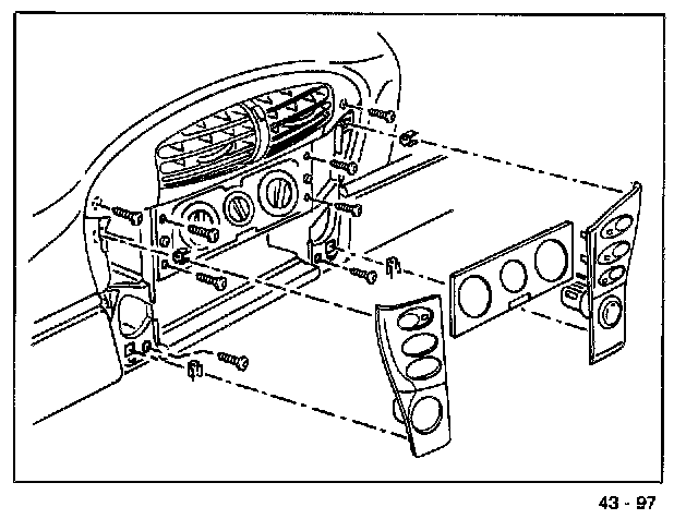 6. Remove radio and heating and fresh-air control. Unclip the switch panel on the left and on the right. Disconnect the electrical plug connections. Undo the retaining frame in the center and remove it.