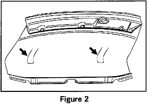 As of MY '00, the rear wall lining in the area of the sheetmetal bracket has been perforated (Figure 2, arrows). This makes the access to the Top Tether fastening point possible, after the perforation is cut out. For MY '00, it is not necessary to remove the rear wall lining.