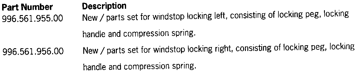 Previously the whole windstop had to be replaced if the locking peg broke. As of now the locking pegs, including locking handle and compression spring, are available as a parts set.