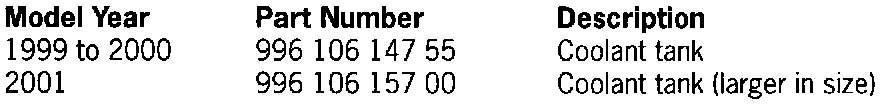 The model year division for the coolant expansion tank has been incorrectly shown in both the Porsche Electronic Parts Catalogue (PET) in main group 1, plate 105-20 and in the parts microfiche edition 2/00. The misprint has been corrected in PET Update 140, which has already been released.
