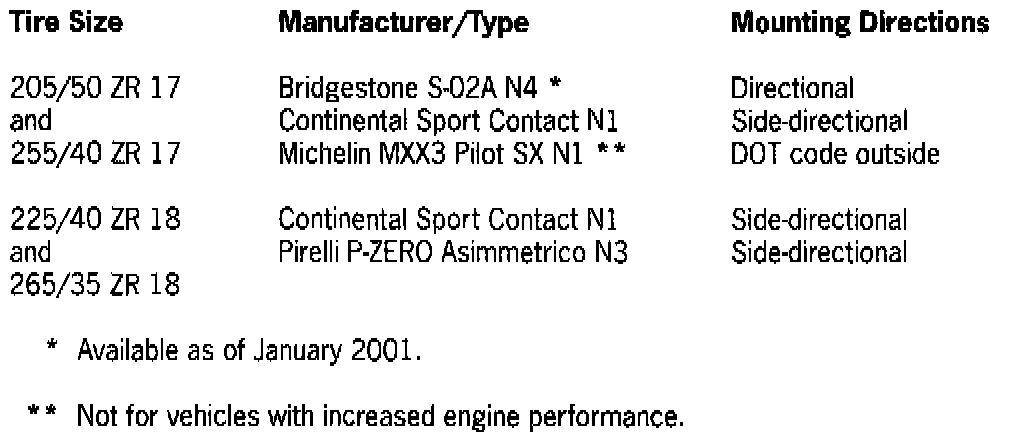 "N0", "N1", "N2", "N3" or "N4" indicates a specification identification of the tires. The complete "N" number must be present and visible on the outside of the tire side wall near the type-designation. Only use tires of the same manufacturer, tire type and "N-" specification on one vehicle.