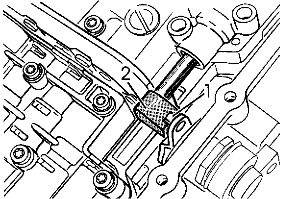 1. Carefully put on hydraulic control unit and insert the pin of the detent disc (1) into the groove of the selector valve (2).