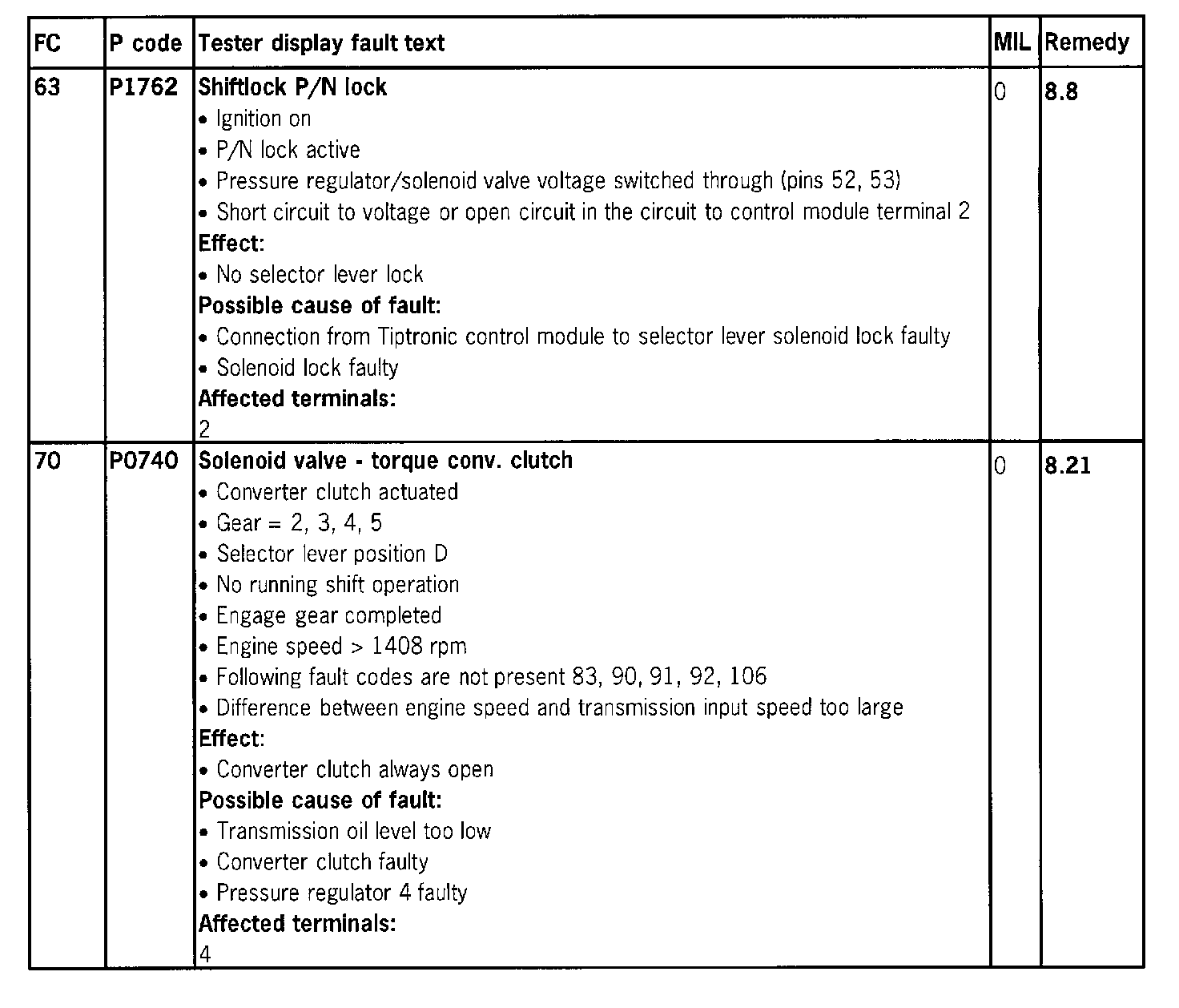 Fault Memory / Fault Code Table