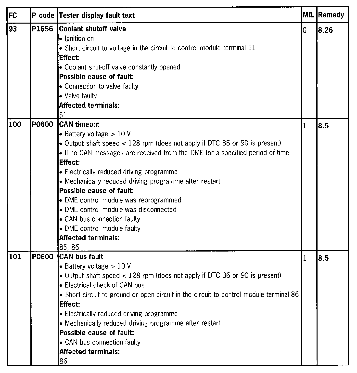 Fault Memory / Fault Code Table