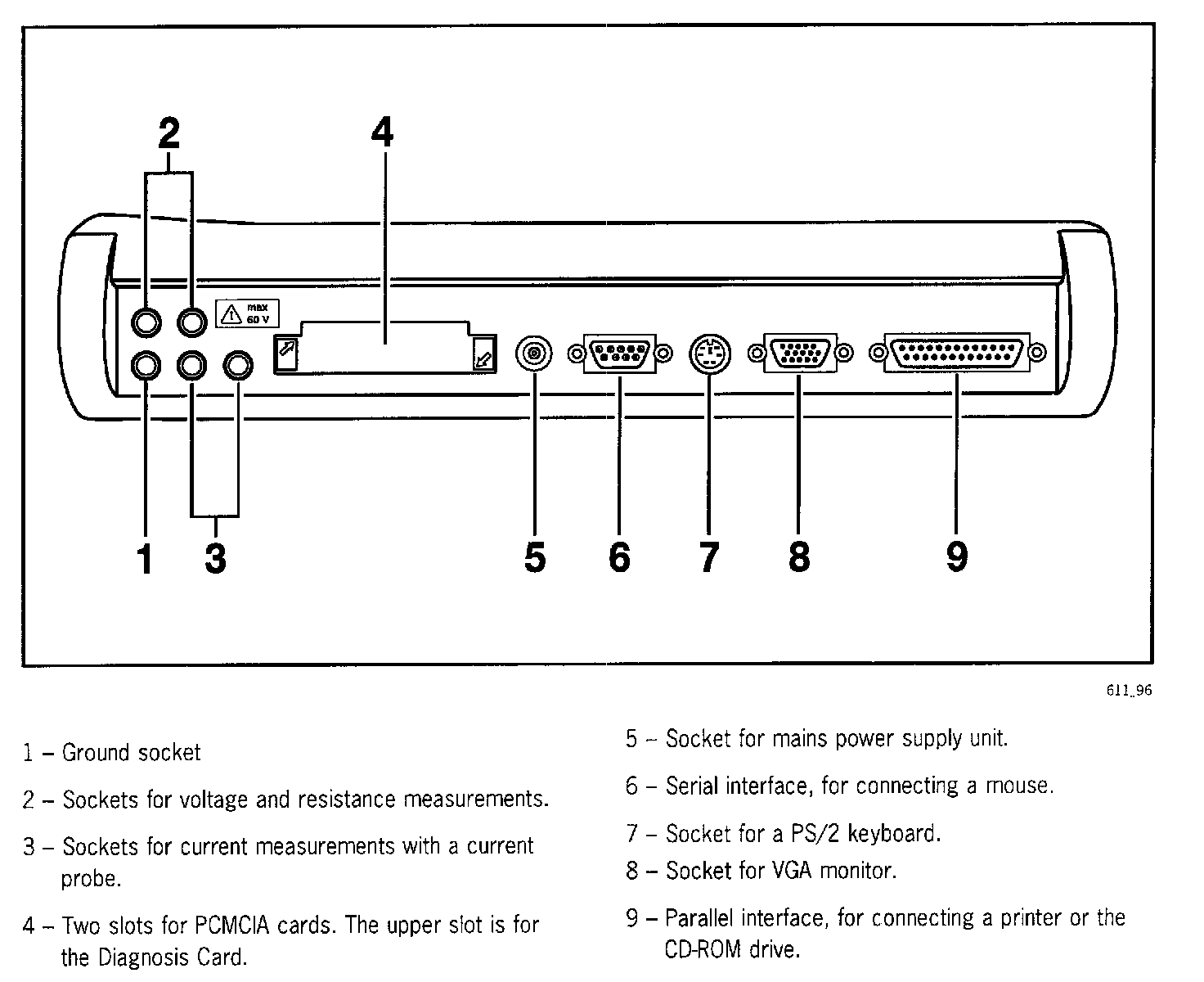 The tester consists of a computer unit, a main memory, a hard disk, a VGA display, a nickel-metal-hydride rechargeable battery and a measuring unit with which current, voltage and resistance can be measured.