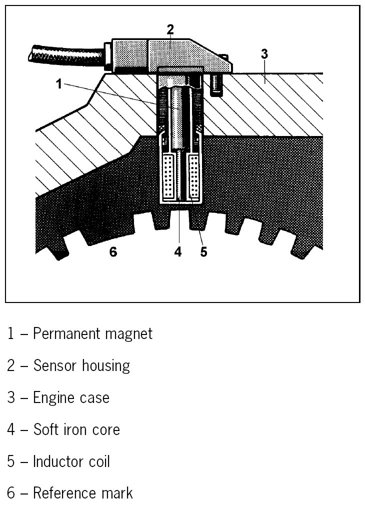 A soft iron core partially bundles the magnetic field produced by the permanent magnet which then enters the space and closes again through the magnetically conductive parts of the engine. A steel toothed ring moving past the face of the sensor affects the magnetic field. The change in the magnetic field induces an electric charge in the coil winding which is used by the DME control module.