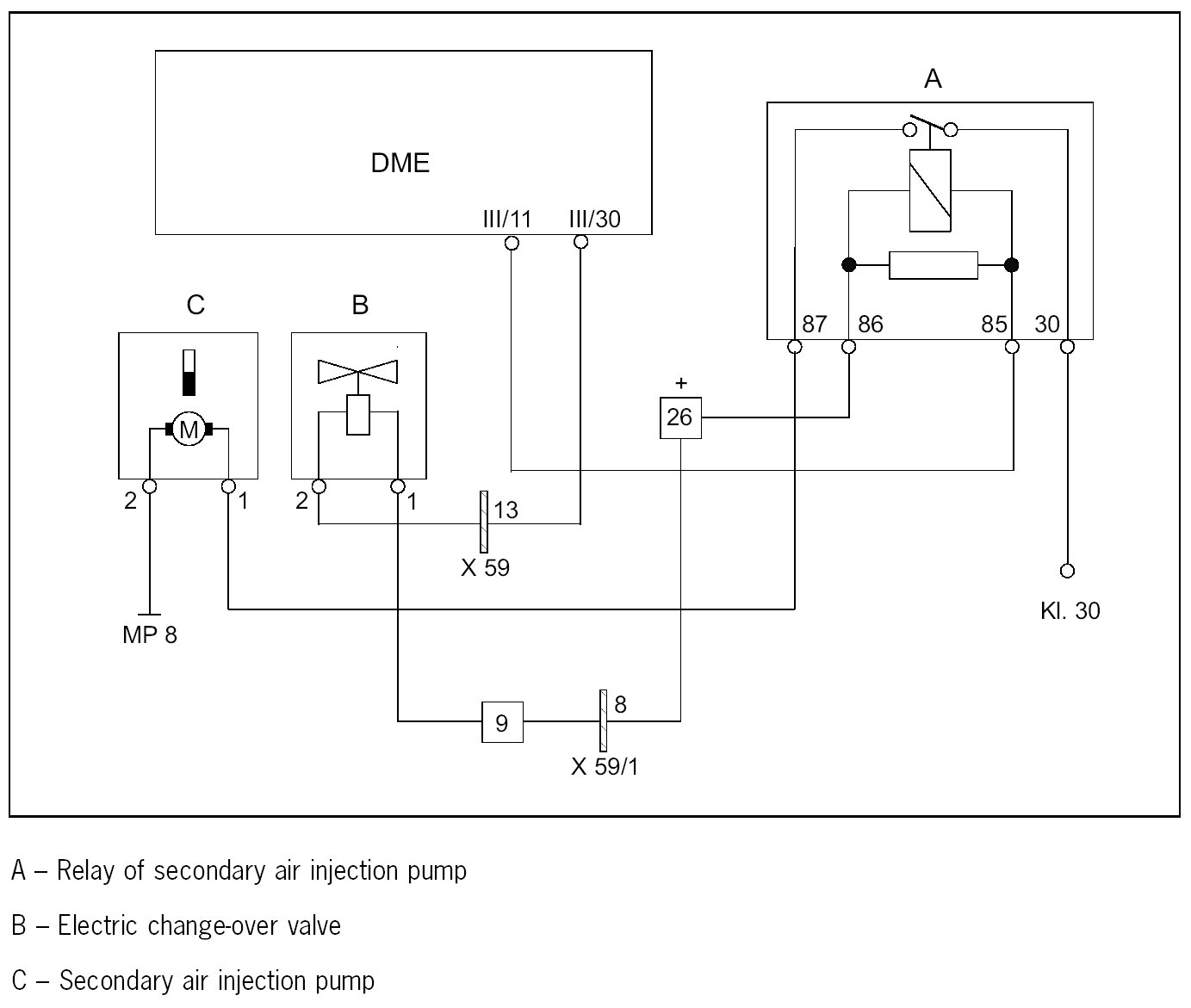 If 0 V is displayed, check DME relay or wire from DME relay, terminal 87, to the electric change-over valve, pin 1, for continuity.