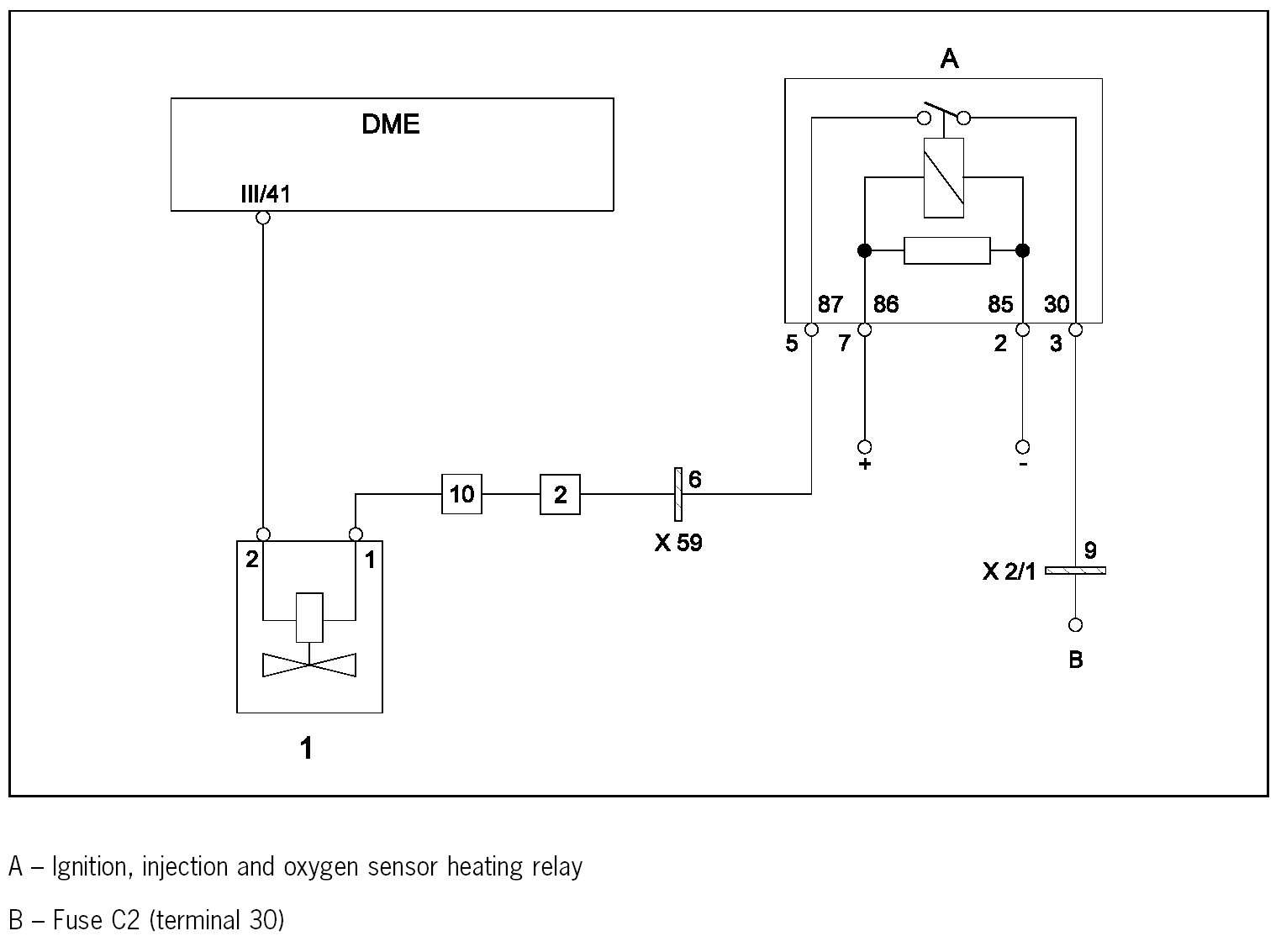 The coil of the fuel injector is supplied directly with B+ (battery voltage) on one side and with ground via an output stage in the DME control module on the other side.