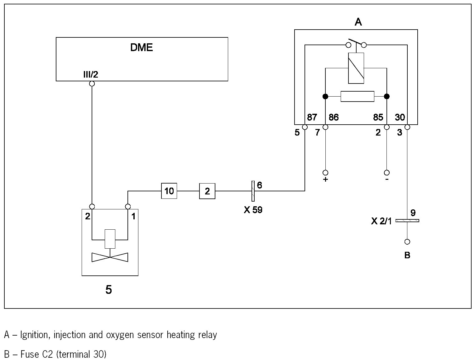 The coil of the fuel injector is supplied directly with B+ (battery voltage) on one side and with ground via an output stage in the DME control module on the other side.