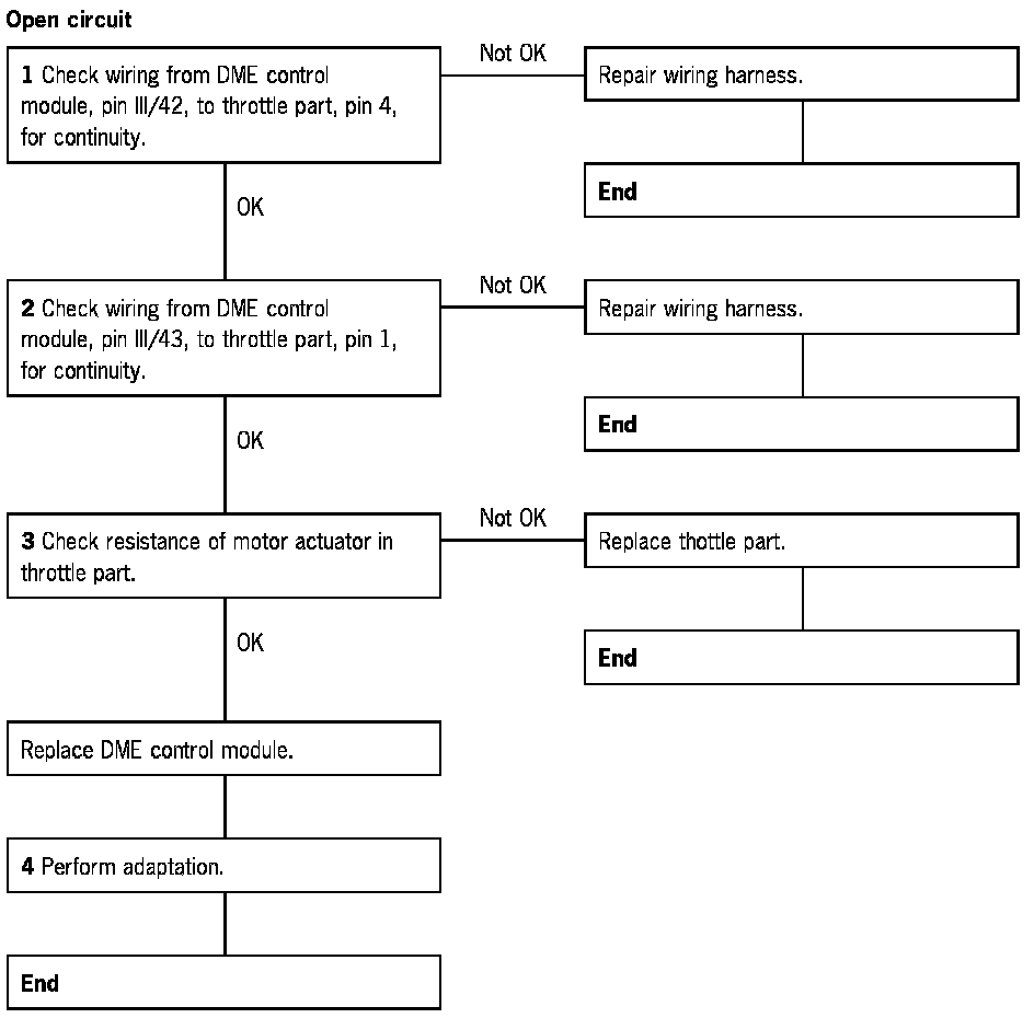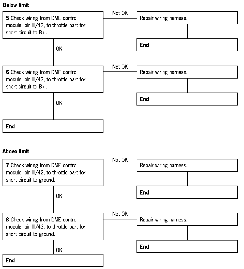5 Check wiring from DME control module, pin III/42, to throttle part for short circuit to B+.