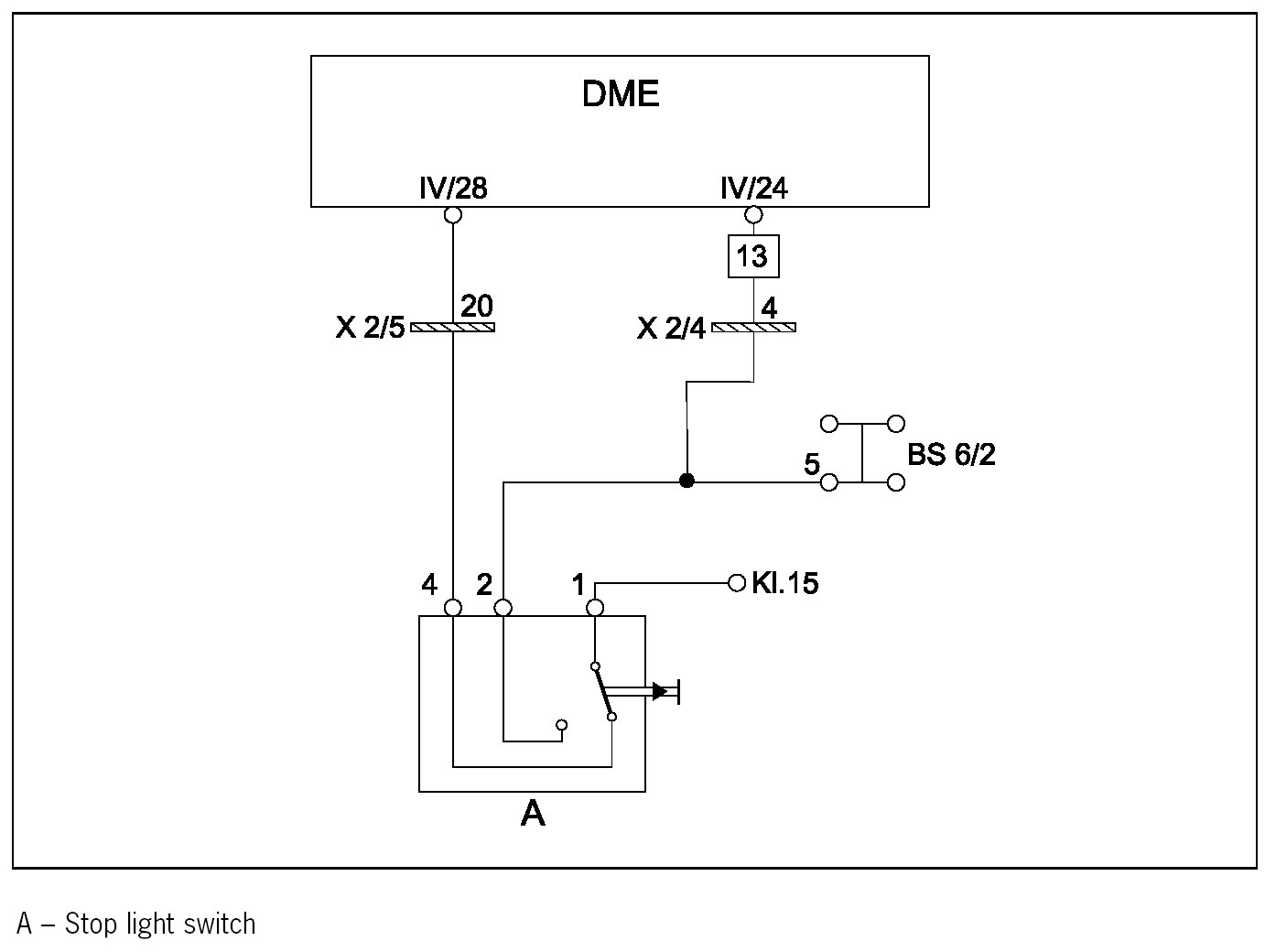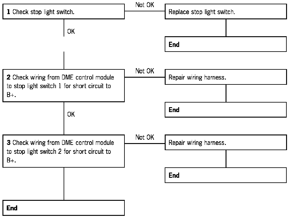 3 Check wiring from DME control module to stop light switch 2 for short circuit to B+.