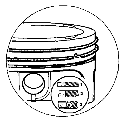 5. install piston rings. This will start the oil scraper ring. Place the gap of the oil scraper ring into the middle point of the piston ring pliers. Carefully stretch the piston ring with the help of the pliers to a point where this can be placed over the pistons into ring groove 3. The gap of the oil scraper ring must be installed offset by exactly 180° into the gap of the oil scraper spring (or offset by 120° into the twist lock of the second ring groove). Make sure that the oil scraper spring is in the oil scraper ring. Then install the stepped taper faced ring (indicated by the lower recess on the outer edge). With the help of the piston ring pliers, insert the stepped taper faced ring into the second ring groove in such a way that the designation "TOP" is pointing towards the piston crown. The twist lock of the second ring groove must be between the gap of the stepped taper faced ring. Insert the taper faced ring into the ring groove in such a way that the designation "TOP" is pointing toward the piston crown.