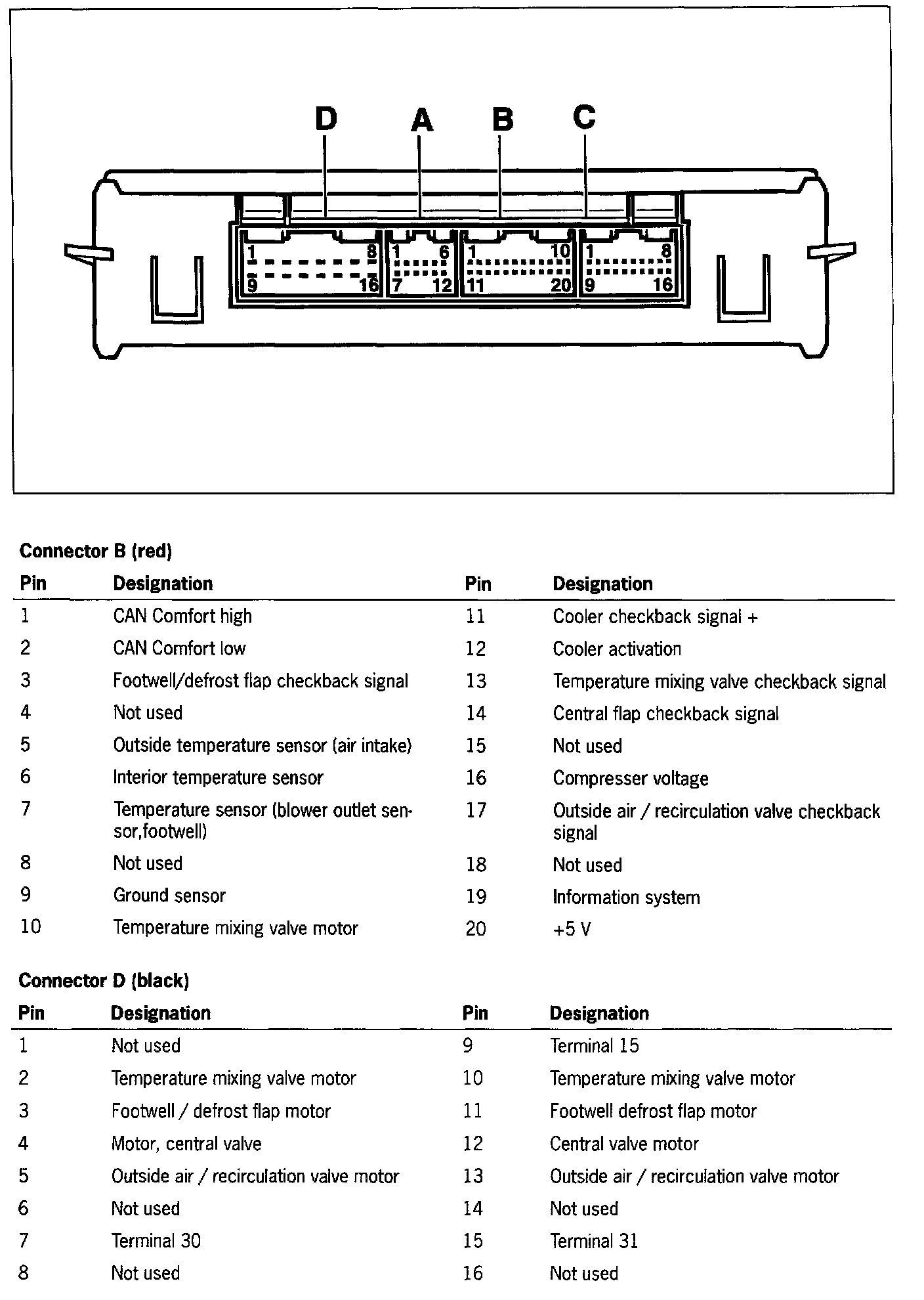 The two plugs, A and C, are replaced by networking (used by CAN Comfort Bus). The signals required for function or control are exchanged via the CAN Bus lines CAN Comfort high and CAN Comfort low.