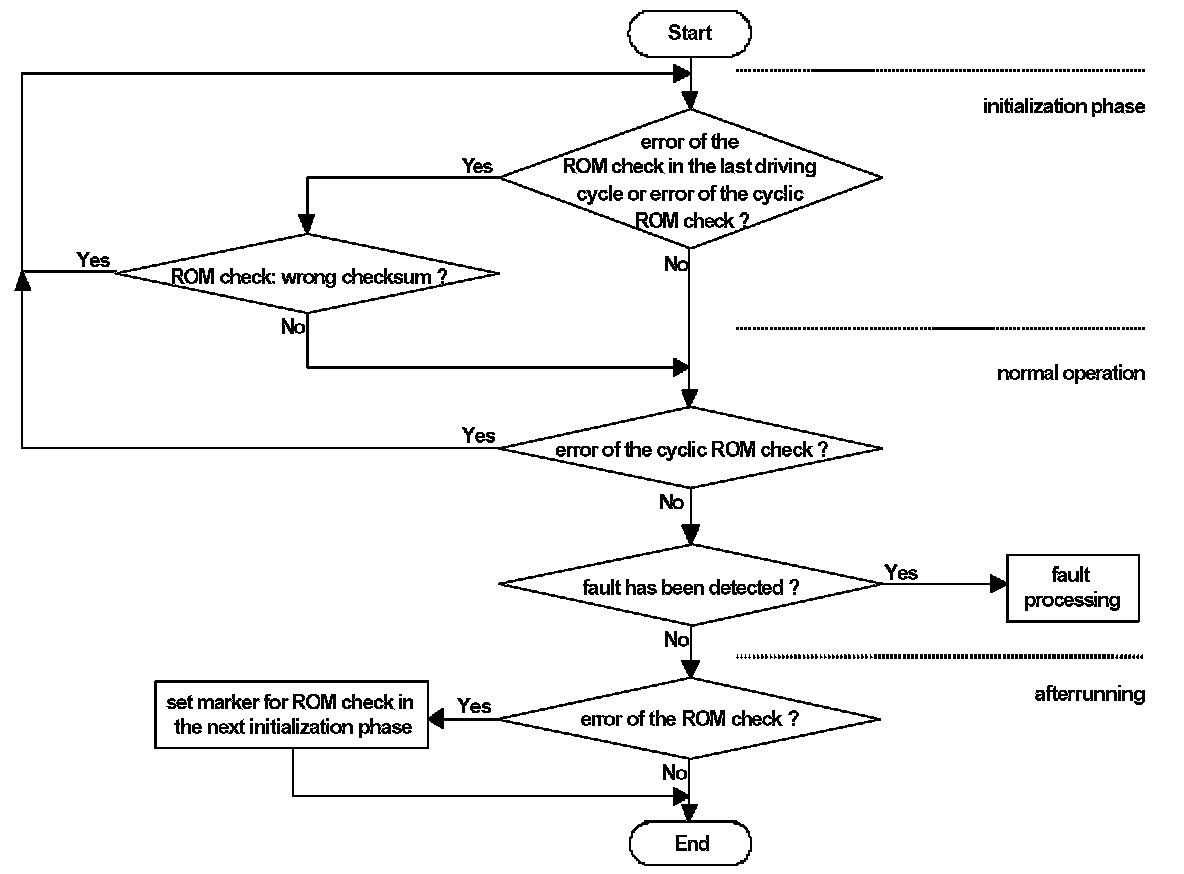 A cyclic ROM check, which checks the checksum of the function monitoring, is performed continuously. A fault detection causes a RESET with a repeated ROM check in the initialization phase, as above.