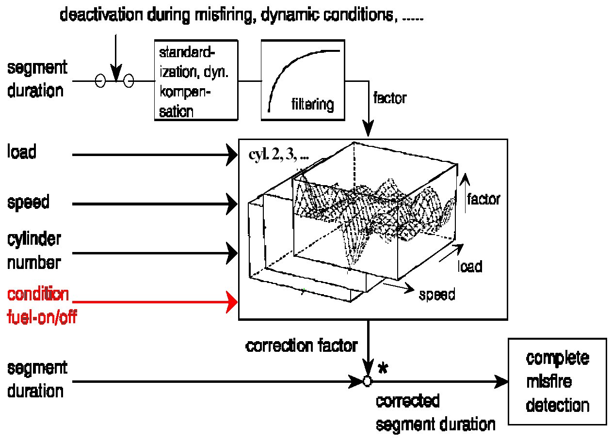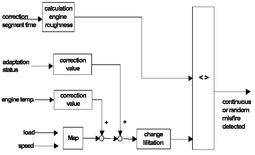 The detection performance is independent of sensor wheel inaccuracies (crankshaft-synchronous segment time fluctuations). However, symmetrical multiple misfires which can also generate crankshaft-synchronous segment time fluctuations cannot be detected. A calculated value is compared to a load and speed dependant threshold. If this threshold is exceeded misfire is detected.