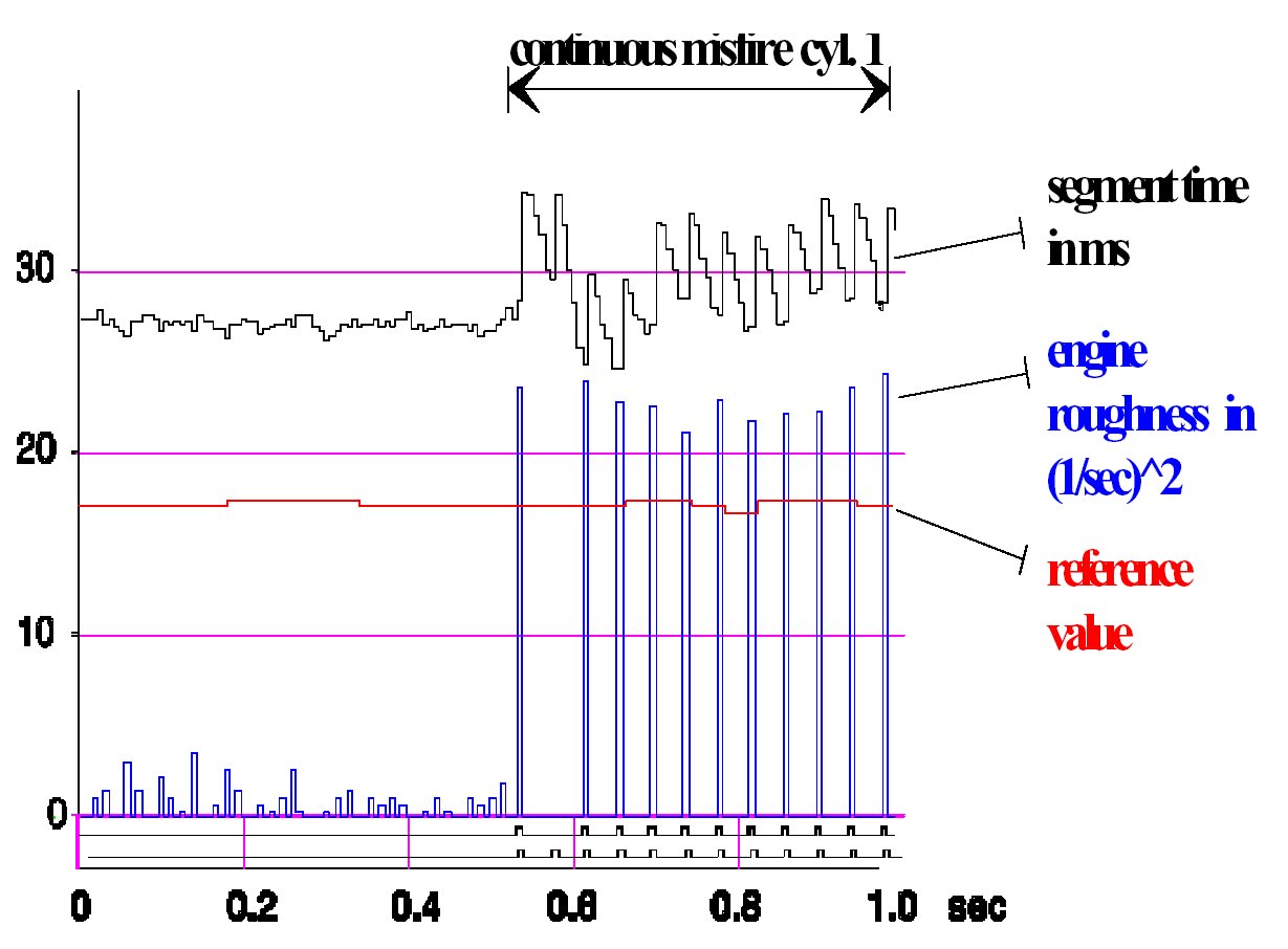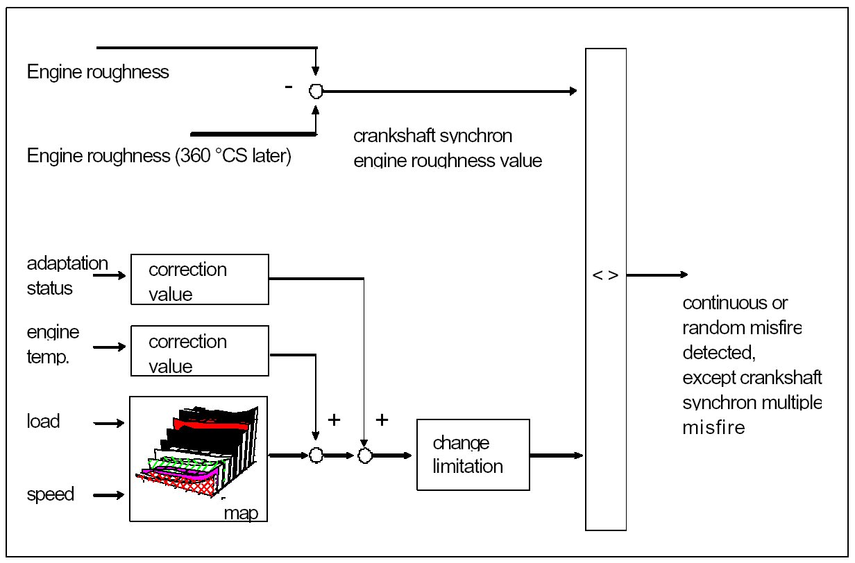An example of continuous misfire in a single cylinder is as shown. Engine roughness is compared to a specific load / speed dependant threshold. If the threshold is exceeded misfire is detected.