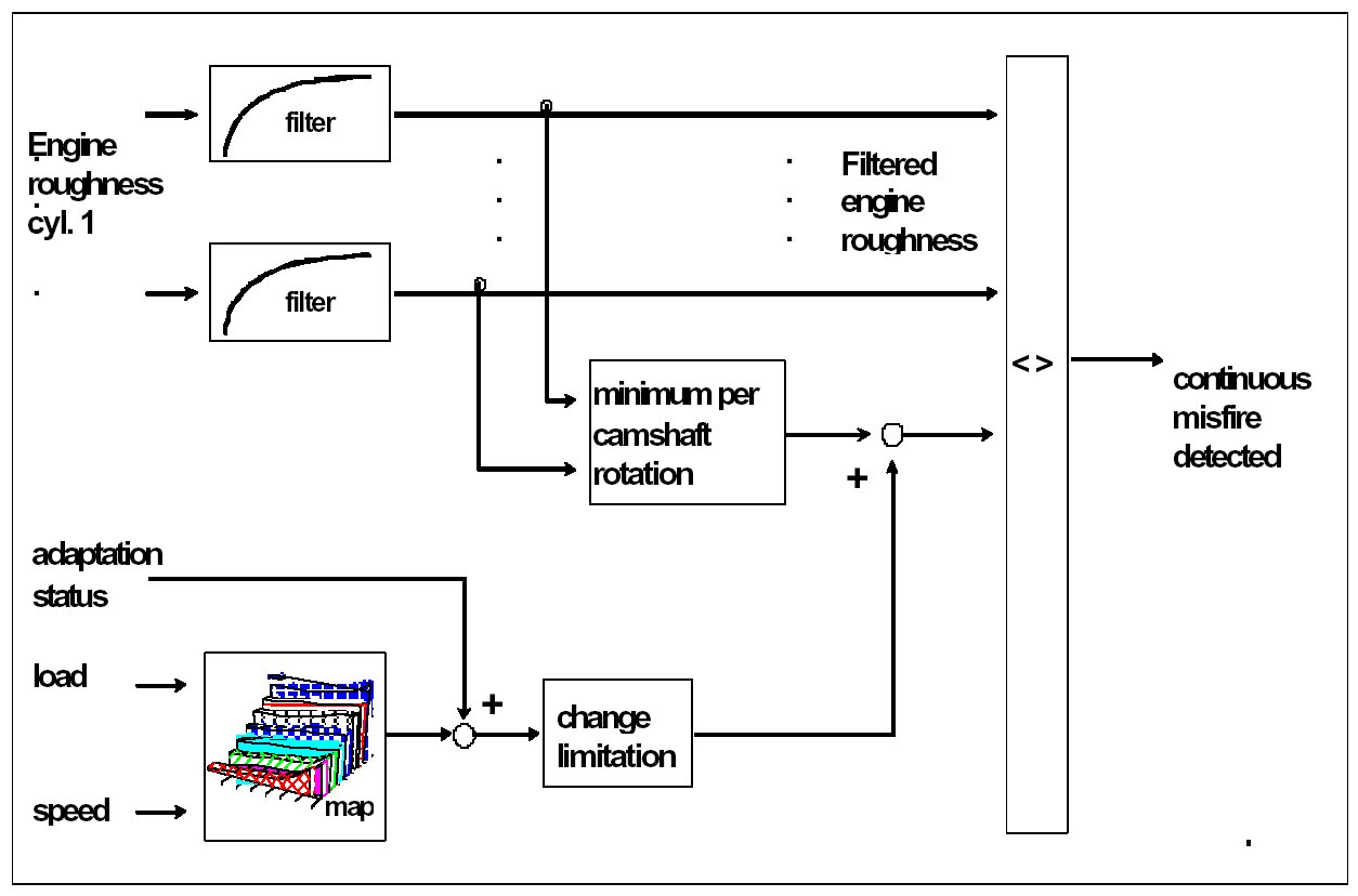 This function allows detection of continuous misfire in one or more cylinders. For this the cylinder-specific engine roughness values are filtered by means of recursive low pass filters and compared to an accompanying threshold / reference value.