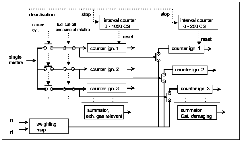 Each combustion, apart from those intentionally deactivated, must be checked for misfire since misfires can be distributed randomly. However, a reaction will only take place if a certain misfire frequency is given. The different effects of the combustion misses, such as increase in exhaust emissions, and catalyst damage, are evaluated separately.