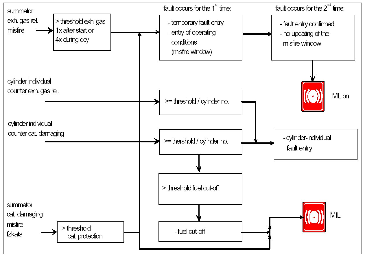 The misfire detection system consists of various subfunctions, which together guarantee a complete detection of all misfires. Common to all methods is the evaluation of segment durations, which are corrected by means of an adaption. The misfires detected by each of the individual methods are logically or'd together and then further processed in the fault code management system. The fault code management system decides, among others, when the MIL is to be triggered.