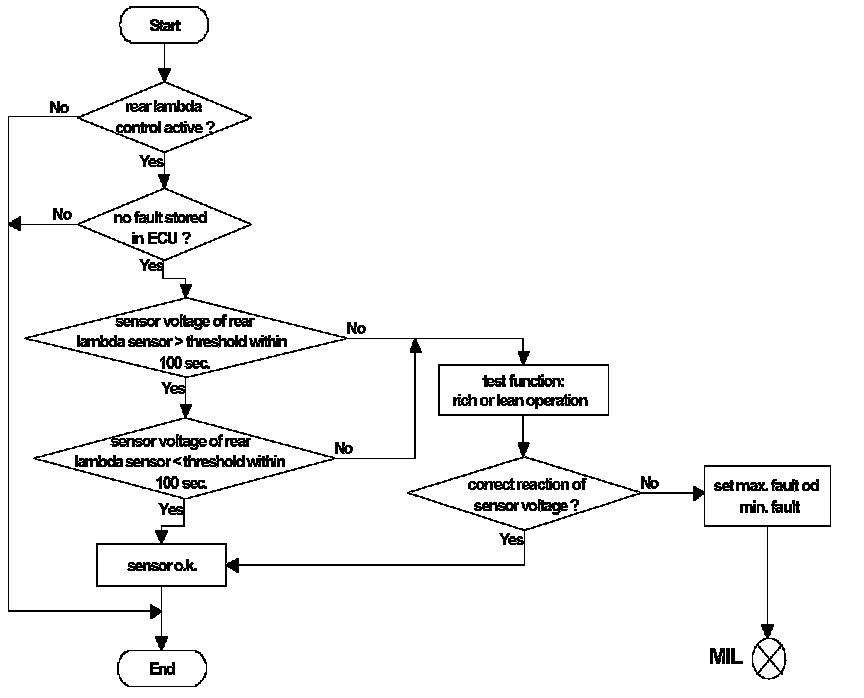 If the sensor voltage remains above or below the threshold, a test function will be started, the system switches to rich or lean operation (Delta lambda(rich) = 10 % , Delta lambda(lean) = 7%). If the voltage was above the threshold, there will be a lean operation and vice versa. This function is interrupted by fuel cut-off, by very low load conditions, etc. If the sensor voltage reacts appropriately (crossing the threshold in the expected direction), the sensor is o.k. If there is no reaction, the sensor is judged as faulty, an error flag will be set and the rear closed loop control will be switched off.